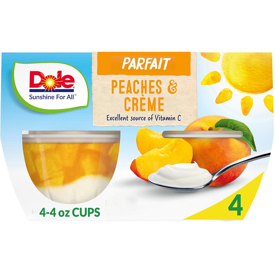 DoleFoodservice 36/4 DOLE Fruit Bowls® Diced Peaches in 100% Fruit Juice . 36/4 DOLE Fruit Bowls® Diced Pears in 100% Juice. 36/4 DOLE Fruit Bowls® Cherry Mixed Fruit in 100% Juice. 6/4 pk/4.3 OZ. Mixed Fruit in Peach Gel. 6/4 pk/4.3 OZ. Mixed Fruit in Black Cherry Gel. 6/4 pk/4.3 OZ. Peaches & Creme Fruit Parfait.