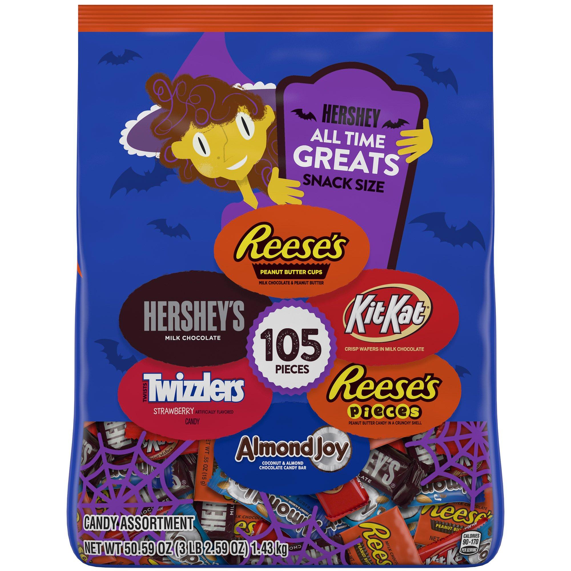 Amazon.com: Candy Hershey and Mondelez Assorted Chocolate, Peanut Butter, Fruit Flavored Snack Size Candy, Halloween, 49.83 oz Bulk Variety Bag (110 Pieces) 4.7 out of 5 stars 18. $14.74 $ 14. 74 ($14.74/Count) $9.99 delivery Thu, Oct 6. LIFE SAVERS Gummy, STARBURST Duos and Original & SKITTLES Wild Berry and Original Fun Size Chewy Bulk Halloween Candy …