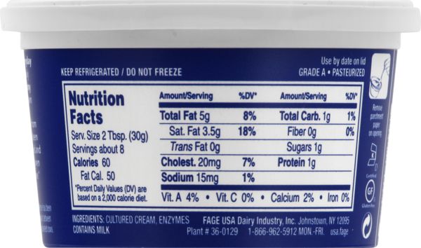 Fage 0% Nutrition Facts & Calories - Inlivo Rich in vitamins and minerals (14.4%/cal) - a good source of Calcium, Phosphorus and Selenium. Contains a moderate amount of risky components that may include saturated fat, cholesterol, sodium and sugars (0.01%/oz). Good source of proteins (35% of DV/100g). This item has no fiber content (0% of DV/100g). Calories in 1 1 Spoonful (4.6 oz)