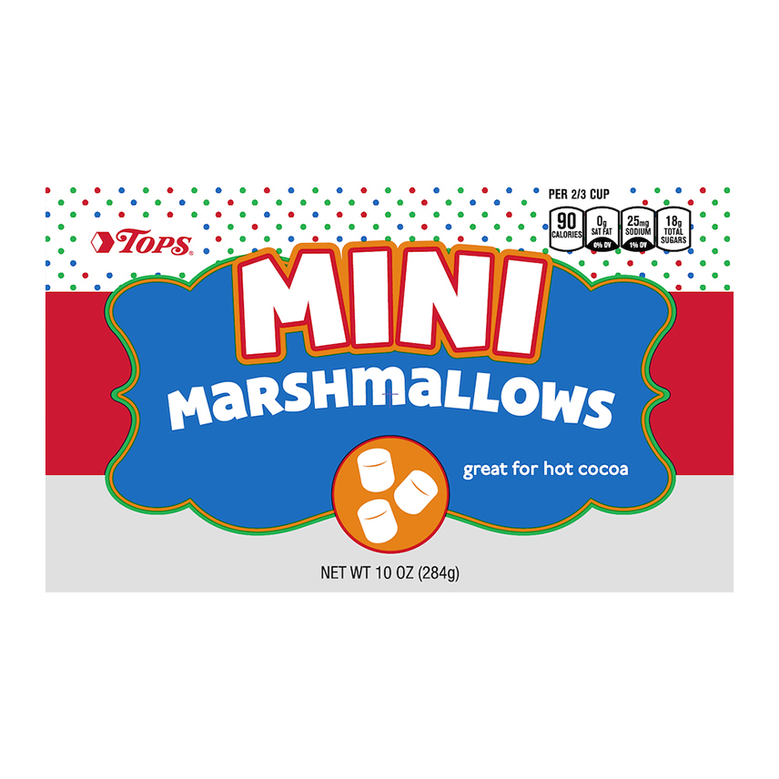 Mini Marshmallows - 10oz - Good & Gather™ : Target Calories: 90 % Daily Value* Total Fat 0g 0% Sodium 15mg 1% Total Carbohydrate 24g 9% Sugars 17g Added Sugars 17 34% Protein 1g * Percentage of Daily Values are based on a 2,000 calorie diet. Ingredients: corn syrup, sugar, modified corn starch, gelatin (pork), water, dextrose, natural flavors, tetrasodium pyrophosphate. Allergens & Warnings: