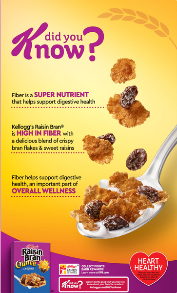 Kellogg's Raisin Bran® Original cereal - SmartLabel™ Nutrition Facts ; 280 mg ; 6% · 15% · 10% ... Kellogg's Raisin Bran Breakfast Cereal - H-E-B Raisin Bran provides an excellent source of fiber and a good source of 8 vitamins and minerals to help you start your day off strong. Whether you enjoy your ...